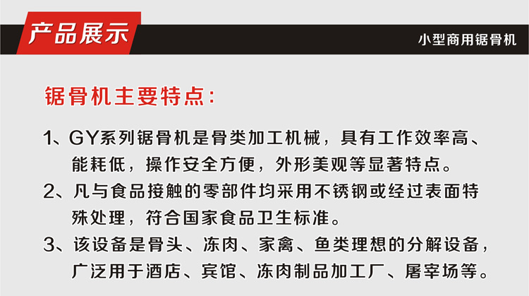 江西眾得力廚具有限公司生產銷售食品機械商用廚具,承接中央廚房項目整體解決方案!餐飲食堂后廚分解凍肉、骨頭設備選用鋸骨機,輕松,快速解決問題,長短可調,分解速度快,效率高,骨頭損害小。本系列鋸骨機有270型和370型兩種型號,270型價格2550元,370型價格6880元