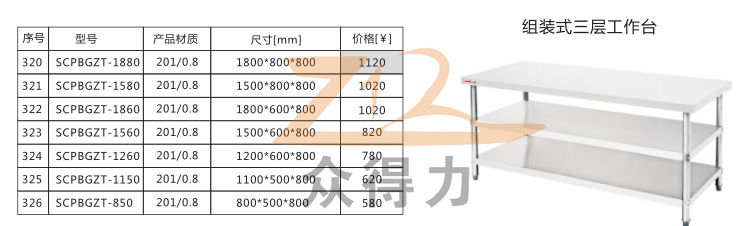 江西眾得力廚具有限公司為您提供中央廚房一站式服務,生產銷售食品機械、商用廚具。本組裝式工作臺有1800型和1500型兩種型號,寬度規格有800mm和600mm可選,板材用料扎實,經久耐用。