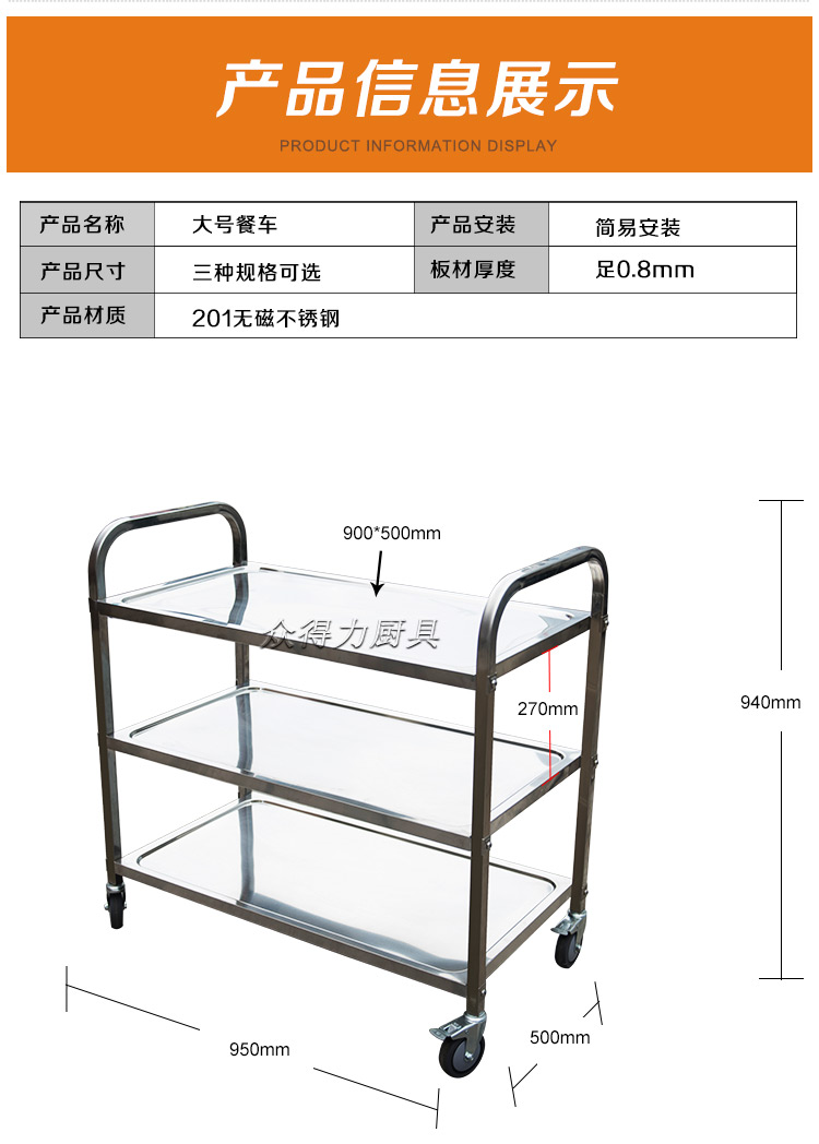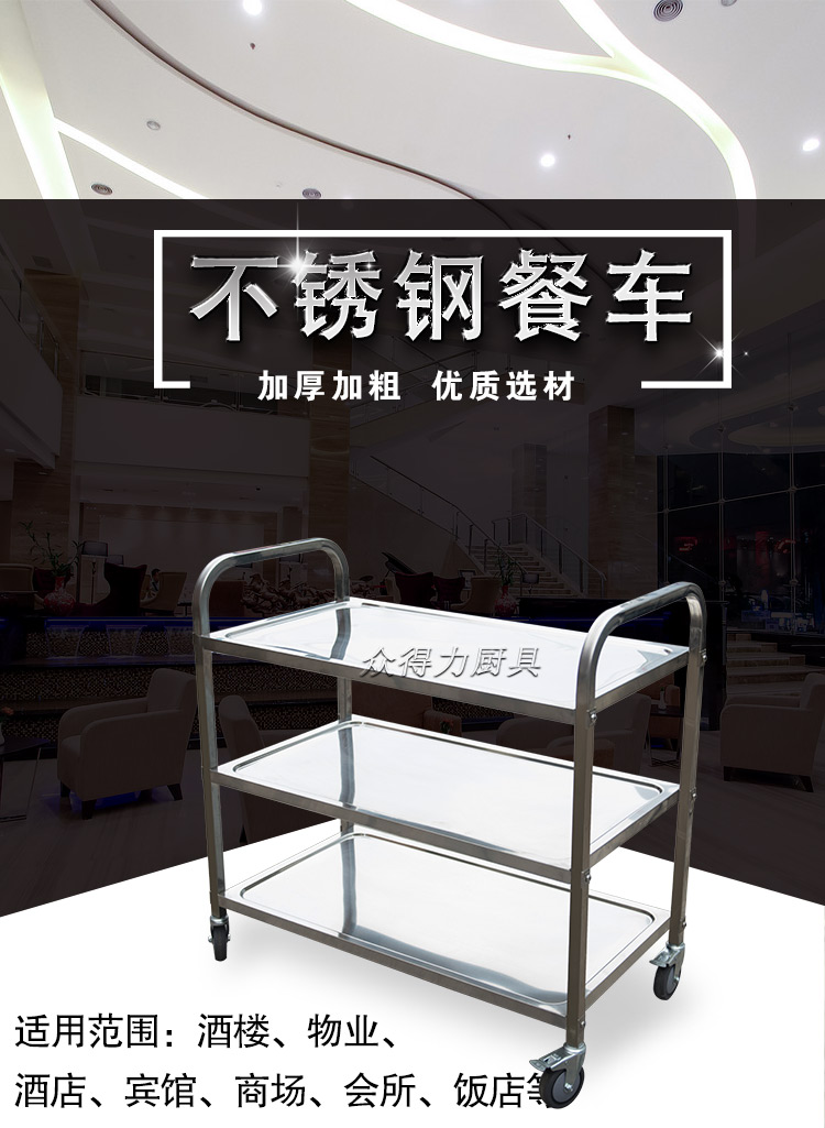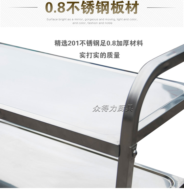 江西眾得力廚具有限公司生產銷售商用廚具,食品機械,提供中央廚房工程項目整體解決方案。不銹鋼餐車有大號、中號、小號,本公司生產銷售的不銹鋼餐車系列均采用201無磁不銹鋼材質,板材厚度足0.8mm,整機拆裝方便,結構牢固,承重能力強。